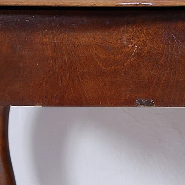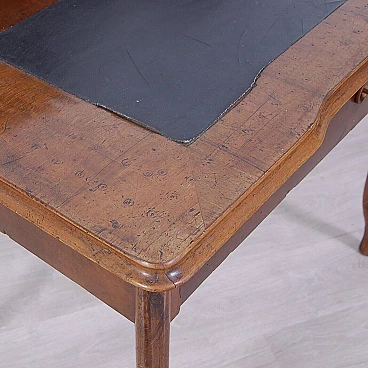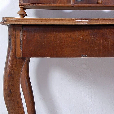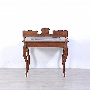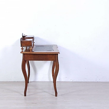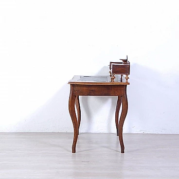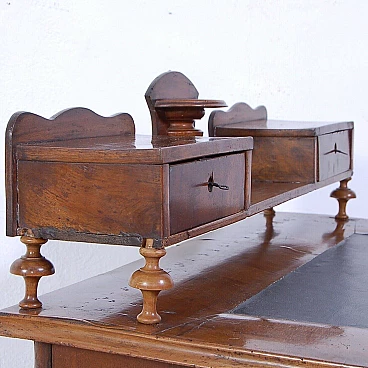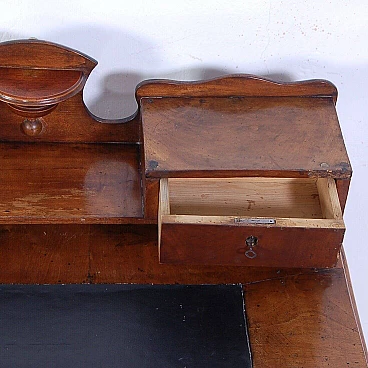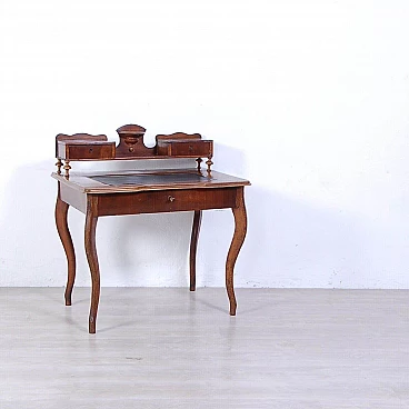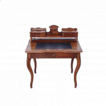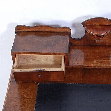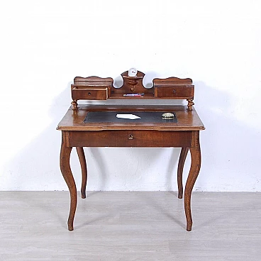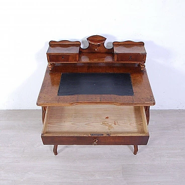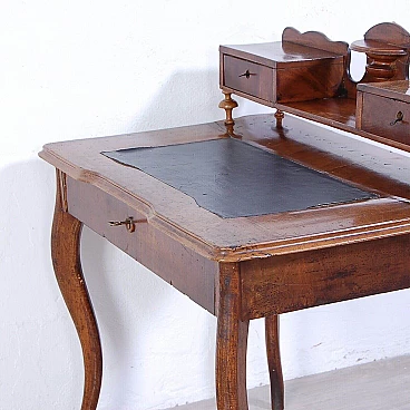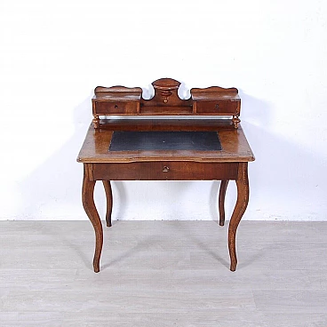 Elegant walnut panelled writing desk, original production circa mid-19th century. Legs with curved shapes, top with central part upholstered in black leather, small drawers and small raised shelves, probably originally the small drawers were placed directly on the top. This leather insert is in very poor condition and tends to detach from the top. The drawer locks are functional but must be handled gently and sometimes with a little patience. The desk is in good structural condition. Solid and intact, it has several scratches on both the top and the structure, some visible in the photo. Conservative restoration is recommended.