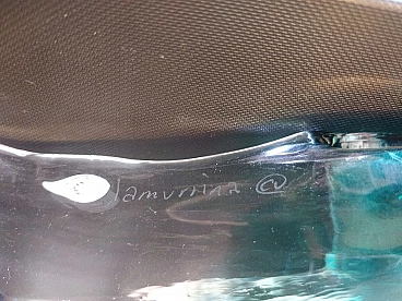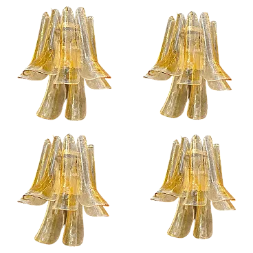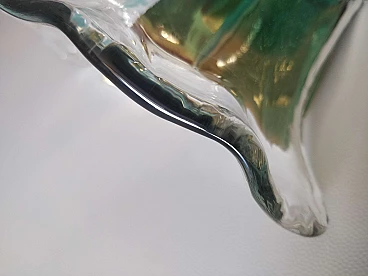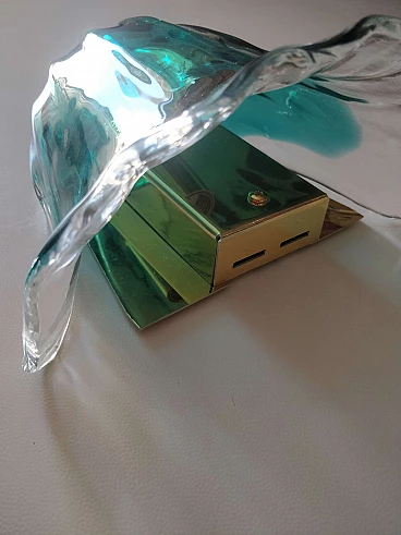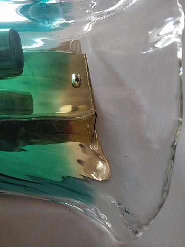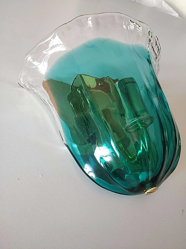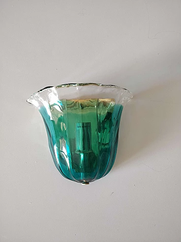 Pair of green and transparent Murano glass wall lights by La Murrina. The design of these lamps is elegant and refined, with the flower-shaped glass exquisitely blending green and transparent elements to create an eye-catching visual effect when the light shines. The glass, with its green glow, warms and diffuses color, while the transparent top adds a touch of brilliance. On the right side, there is the engraved signature "La Murrina." These are one-light lamps. Those of murrine is a distinctive glassmaking technique that involves creating intricate patterns or images within the glass. It is the result of cutting a glass rod made by assembling different colors of glass in order to execute a defined pattern; it can have different sizes, from a few millimeters up to a few centimeters, depending on the use and the result that best suits the master glassmaker.