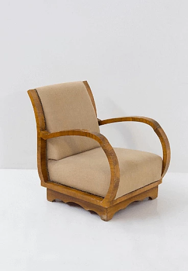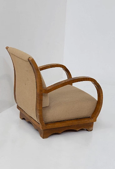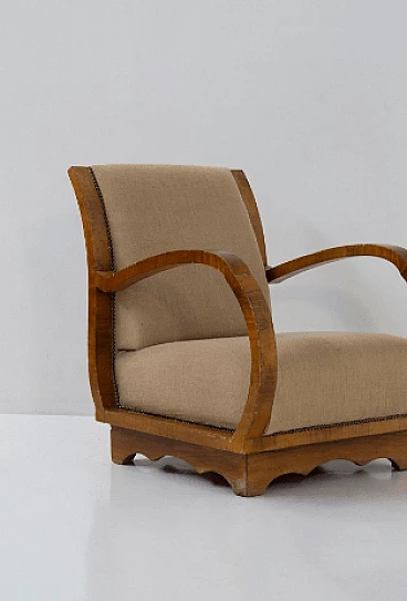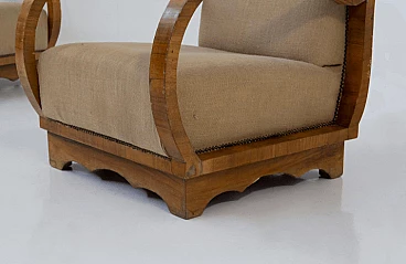 Pair of exquisite Italian armchairs from the 1950s, testimony to the craftsmanship that characterized a golden age. Carved in wood with a handcrafted touch, these armchairs are a living tribute to the tactile poetry of their creators. Curves and wavy lines characterize its structure. The armrests curve gently to welcome those sitting down with a comforting caress. In the lower part, the seat is a set of waves, a sculpted element that captures the essence of movement. Every curve is a nod to the fluidity of the design. The base itself becomes a theater of daring undulations and leaps, each ascent and descent an ode to refinement. The backrest curves with a grace reminiscent of a light breeze; it is as if the armchair encompasses the natural contours of the spine, inviting you to lean back and enjoy its support. A communion of design and comfort. Upholstered with the original beige cotton fabric. Along the edges, elegant studs frame it with a touch of sophistication. Seat height: 35 cm. In original period condition, wear and flaws present. They need to be restored (a restoration can be carried out on request).