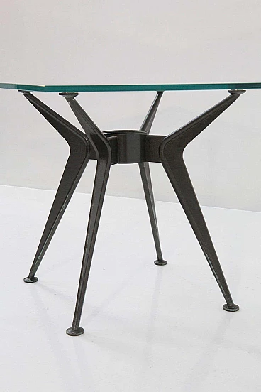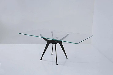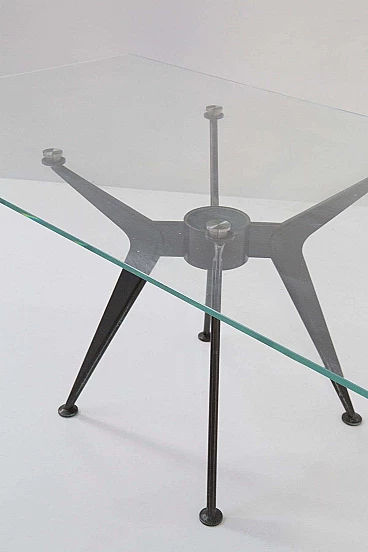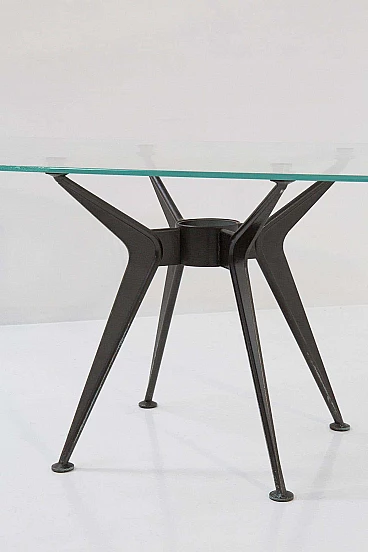 In a world where design transcends time, there emerges a masterpiece that dances on the delicate line between the past and the future. A relic from the late 1970s to the early 1980s, this dining table is not merely an artifact of its era; it is a symphony of glass and iron, a creation attributed to none other than the visionary, Norman Foster. As your fingers graze the smooth surface of the transparent glass tabletop, you can almost feel the pulse of creativity that once coursed through the veins of the mastermind behind this marvel. The glass, thick and unyielding, captures the essence of transparency in its most literal form. It welcomes light, plays with reflections, and invites conversation to flow effortlessly around its shimmering perimeter. But it's the iron frame that truly steals the spotlight—a sculpture in its own right. The legs stand proud, a testament to geometry's elegance and power. Each line, each angle, is a brushstroke in an abstract painting, a portrayal of dynamic movement frozen in time. The feet, a study in balance, echo the shape of saucers, grounding the table with a whimsical touch that defies its industrial material. Ah, but the heart of this masterpiece resides in its pedestal ends, a detail that invites intrigue. Anchored by a metal disc, the pedestal speaks of stability and connection. It's as though Foster himself designed not just a table, but a dialogue between form and function, a conversation that spans decades and blurs the boundaries of design eras. Run your hand along the metal joints—connections that hold secrets of craftsmanship and engineering. They are not just mundane links; they are the veins that give life to the intricate anatomy of this table, a fusion of creativity and construction, of artistry and utility. And as your eyes drink in the beauty before you, a sense of timelessness takes root. This table, with its bold essence, finds itself equally at home in the modern spaces of today and the postmodern dreams of yesterday. It defies temporal constraints, beckoning you to partake in its narrative, a narrative that celebrates innovation and resonates with the echoes of an artistic soul.