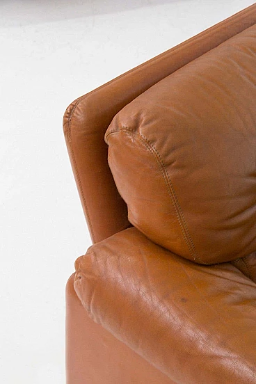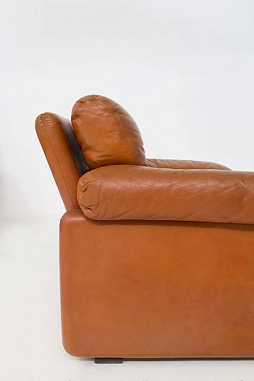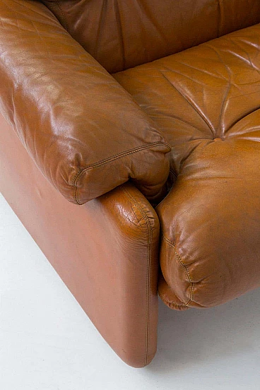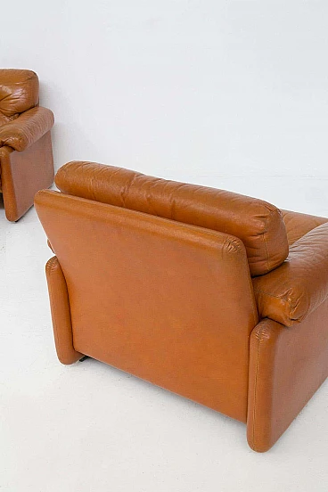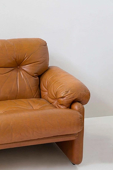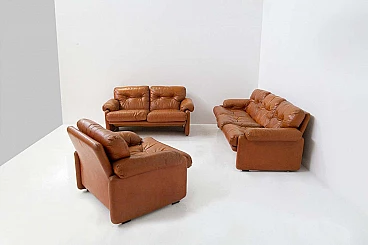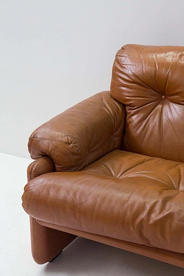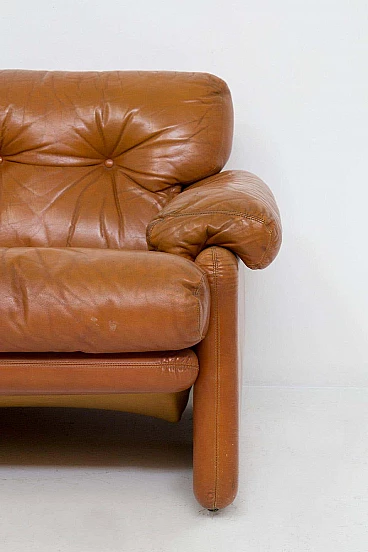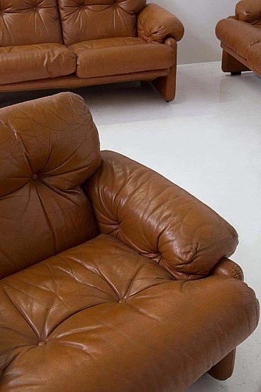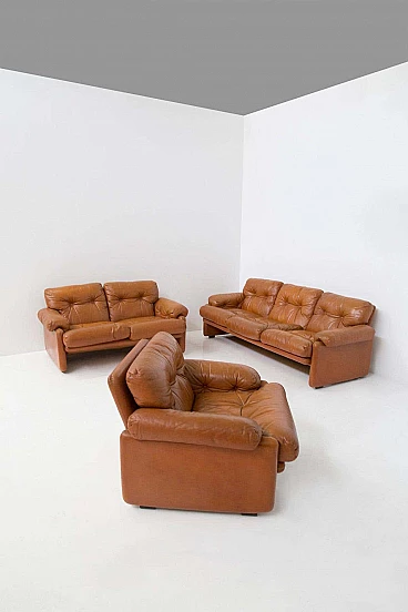 Step into a realm of timeless elegance where the echoes of the 60s resound in every carefully curated detail. Behold the splendor of an elegant living room, a sanctuary of style, graced by a magnificent set crafted by the skilled hands of Afra and Tobia Scarpa, the Coronado model for B&B Italia. As you step into this living masterpiece, you are transported to an era of refined taste and sophisticated design. The allure is unmistakable – a duo of plush sofas and an inviting armchair, all swathed in the richness of brown leather that carries with it the whispers of a bygone era. This is the embodiment of the Mid-century Italian style, where every curve and contour seems to hold a story, a secret from the past. A sensory delight awaits as you run your fingers across the supple surface, tracing the age lines that map out the journey of this vintage treasure. The Coronado set is not merely furniture; it's a portal to an era when craftsmanship was revered and designs were infused with soul. The soft shapes, reminiscent of a time when comfort was a work of art, beckon you to sink in and savor each moment of reprieve. The harmony of form and function is palpable – a testament to the Scarpa's mastery. The rigor of design, apparent in the well-defined lines, merges seamlessly with the enveloping embrace of each piece. Their very existence is an ode to comfort, an invitation to relax and linger in a world where time moves at a more leisurely pace. The leather, with its patina and character, weaves a narrative that transcends mere aesthetics. It's as if you're wrapped in the embrace of a time when attention to detail was paramount, when the tactile sensation of leather was a source of comfort and familiarity.