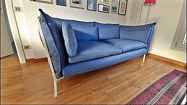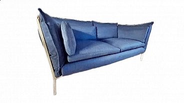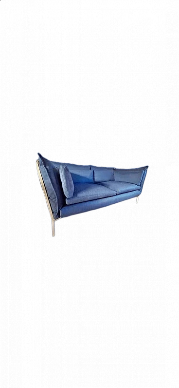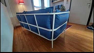Three-seater sofa manufactured by Cappellini and designed by Ronan and Erwan Bouroullec with metal frame and upholstered cushions. White lacquered tubular metal frame. Blue-coloured upholstered cushions, filled with goose down and leather laces (one of which needs to be adjusted). Removable and washable covers. In good condition. Height 76 cm, width 190 cm, depth 80 cm, seat height 44 cm.