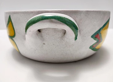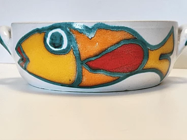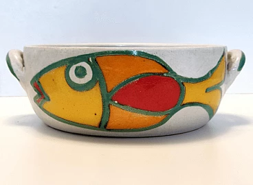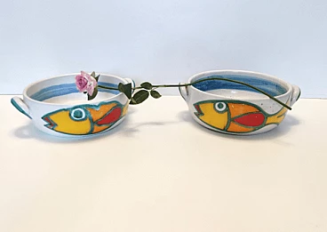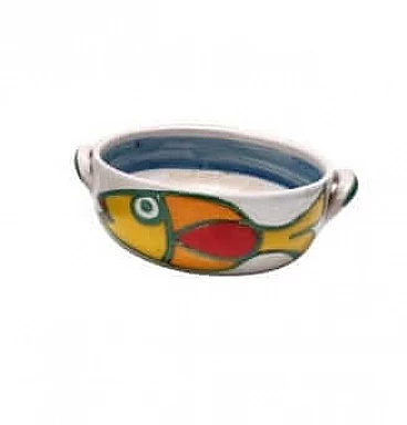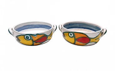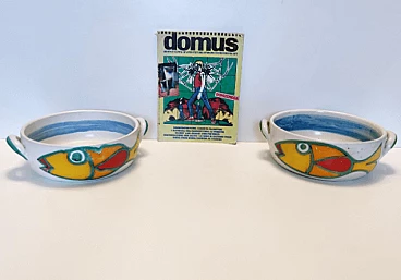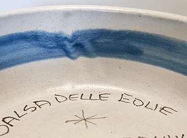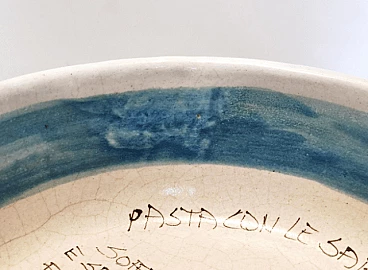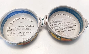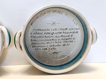 Bowl/centrepiece by Giovanni De Simone in hand-modelled and glazed terracotta, 1960s. Two pieces available (price per piece). Both can be used as centerpieces or as serving bowls, especially for pasta. In fact there are two recipes written above, "Aeolian sauce" and "Sicilian-style pasta with sardines". On the lower part there is the wording "De Simone 64" (probably referring to the year 1964) and on the other the wording "De Simone Cefalù" (a splendid ancient city near Palermo). They may show slight traces of use but can both be considered in excellent original condition. One of them is 11 cm high, the other 10 cm; the difference is due to the handmade process. The diameter is the same.
