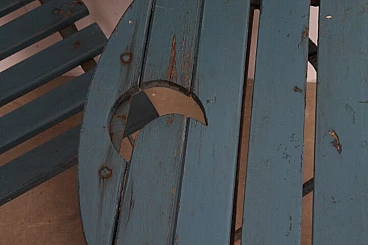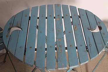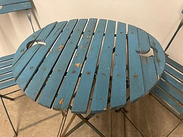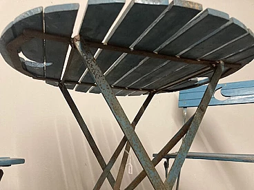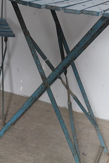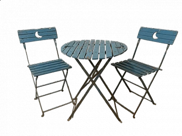 Light blue lacquered garden folding side table and pair of chairs, 1950s