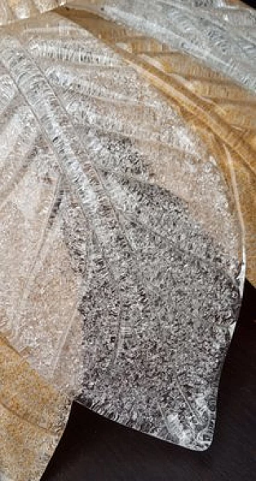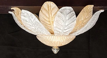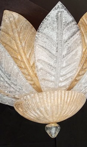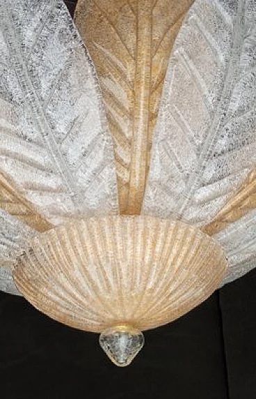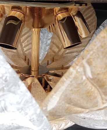Murano glass ceiling lamp worked on sheet with fire-applied dew groove. Crystal and amber colour. The grey dew applied to the fire makes the lamp brighter when the lights are turned on. Internal structure in gilded metal. Six lights with original E14 lamp holder suitable for LED or filament bulbs. Electrical system checked and in working order.