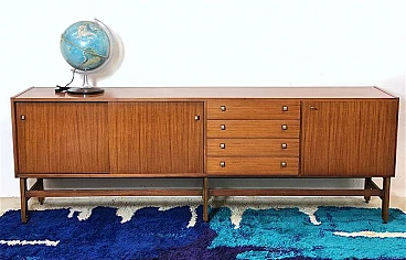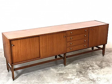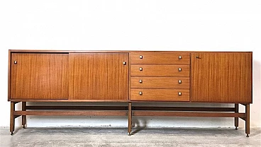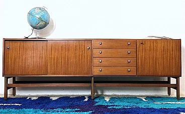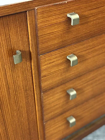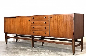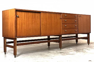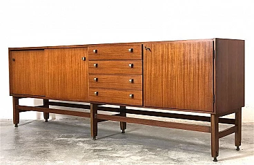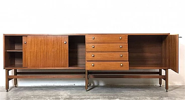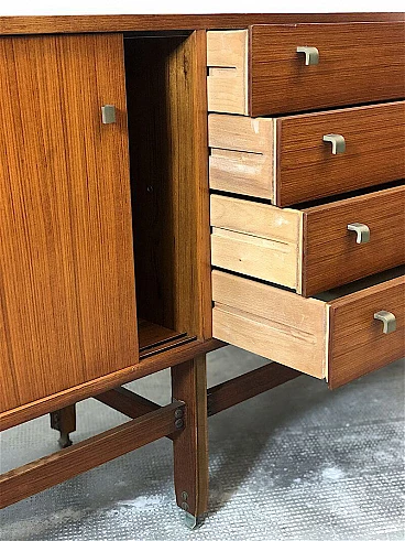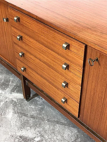 Sideboard made entirely of teak veneered wood with brass details, 1960s. Equipped with two sliding doors with related internal shelf, four drawers, compartment with opening door. Brass handles and hardware. The structure is supported by a teak wood frame with brass feet. It is an example of the rational and elegant design typical of the 60s. Restored and sanitized.