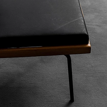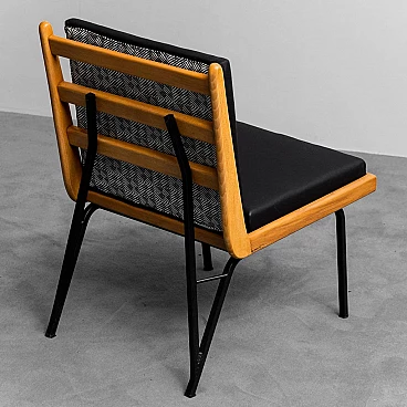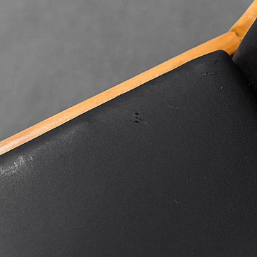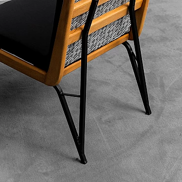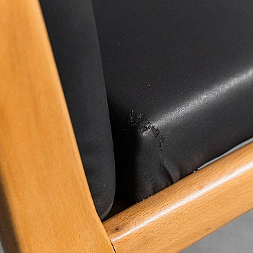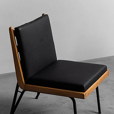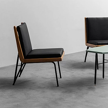 Pair of armchairs with coffee table produced in the 1960s. Wooden frame with metal details and black skai upholstery on the armchairs. Sage green wooden coffee table base. Very good condition, slight signs of time. Coffee table width 80 cm, coffee table depth 40 cm, coffee table height 43 cm. Armchair width 50 cm, armchair depth 60 cm, armchair height 72 cm, seat height 40 cm, seat depth 40 cm.
