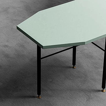 Pair of wooden and skai armchairs and coffee table in sage green wood, 1960s