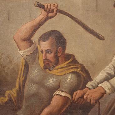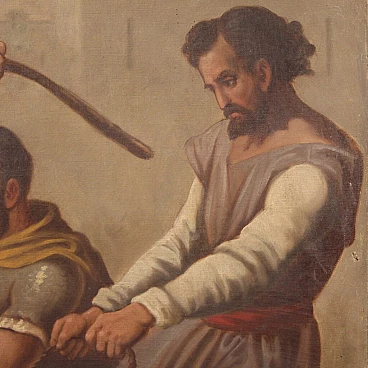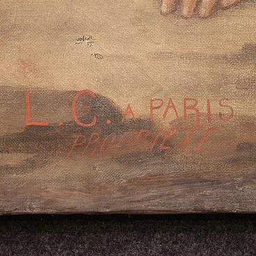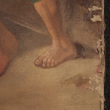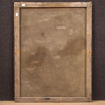 Antique French painting from the late 19th century. Oil on canvas painting, first canvas, depicting a religious subject, Via Crucis, of good pictorial quality. Painting that develops vertically, with good brightness and great pictorial understanding. It has a reference to the previous ownership at the bottom left (see photo). Work with signs of aging, some color drops and two small holes in the canvas (see photo) in need of restoration. Painting that has undergone conservative restoration with patches on the back (see photo). In beautiful patina, overall in fair condition.