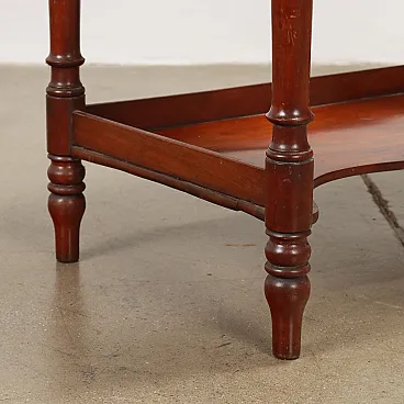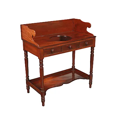 Mahogany toilet with carved railing, top with central compartment on which the ceramic basin rested and three drawers in the under-shelf band, the central one of which is false because it is positioned at the compartment. Four turned legs joined by a shaped top. England mid-19th century.
