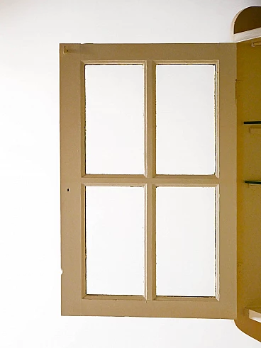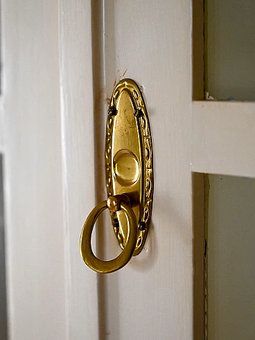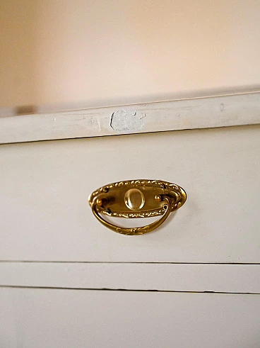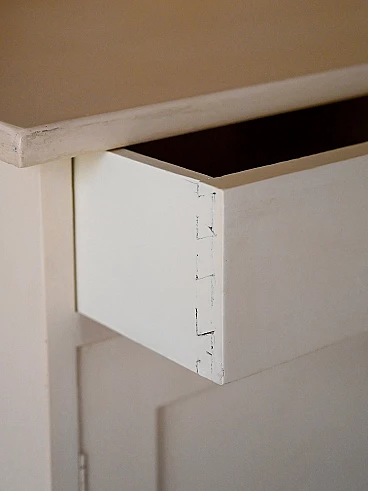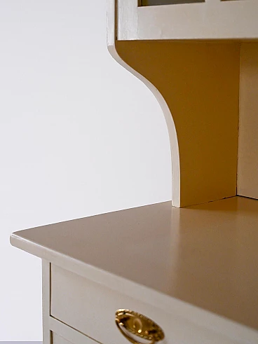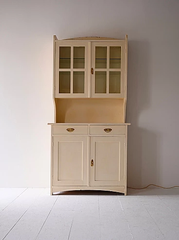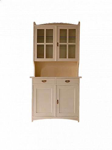 Vintage white lacquered wooden cabinet with interior light. An original sideboard in classic Shabby style consisting of two parts. The lower part consists of two drawers and a compartment with hinged doors while the upper part is a compartment with wooden and glass doors. The interior has a functioning original period light. A piece of furniture suitable for both classic and contemporary settings, perfect for adding a vintage touch to a room. Good condition. A conservative restoration has been carried out. It may show some signs of time. Please pay attention to the photographs.