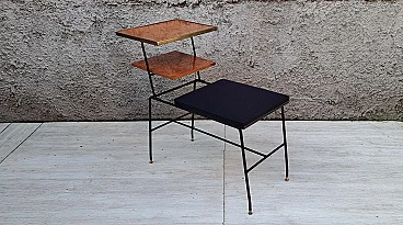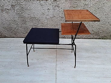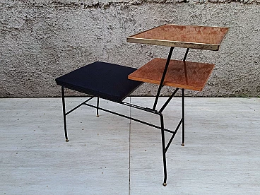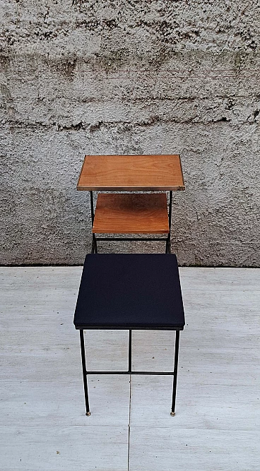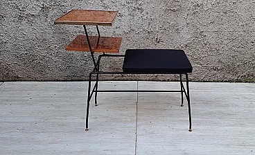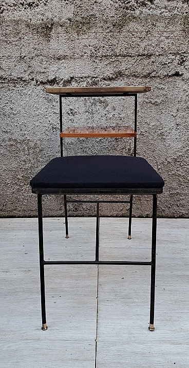 Telephone bench/gossip chair, 1960s. Black iron structure, two wooden shelves, brass feet and top shelf border, padded seat upholstered with new fabric.
