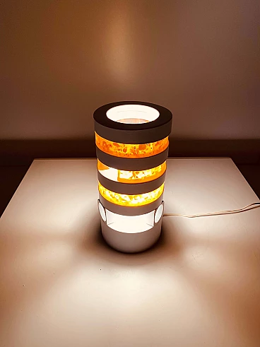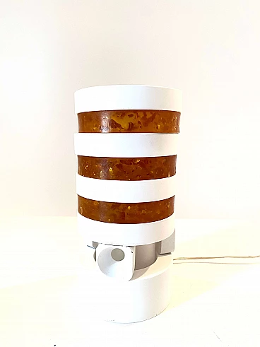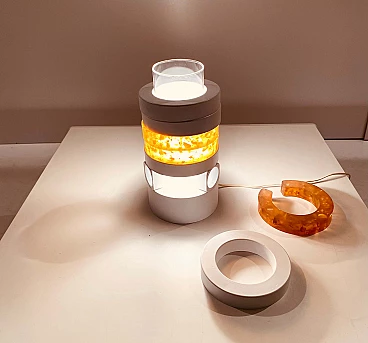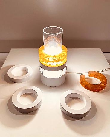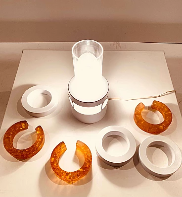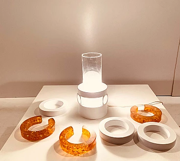 Vintage 1970s table lamp in Space Age style. Made in Italy, the lamp consists of seven rings (four white and three amber) and a tubular glass shade. The rings can be positioned according to taste and the type of light you wish to display. The rings and the lamp base are all made of resin. In very good condition. The electrical parts have been serviced. Fully functional.