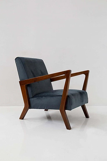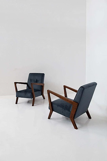 Pair of blue velvet and walnut armchairs, 1960s 1