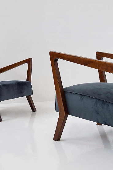 Pair of blue velvet and walnut armchairs, 1960s 2