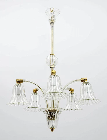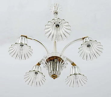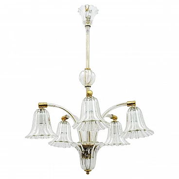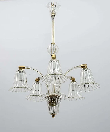 This five-light chandelier was designed and produced by Ercole Barovier in the 1940s. It is made of Murano glass and brass.