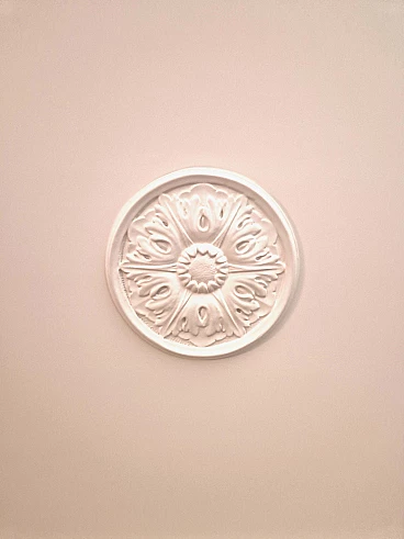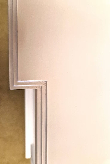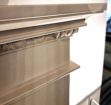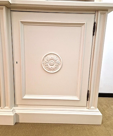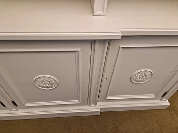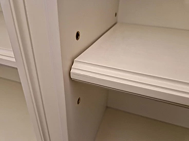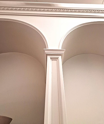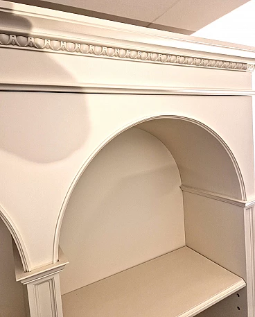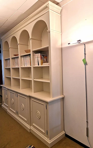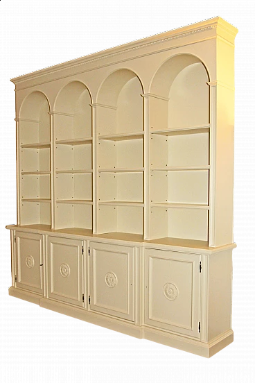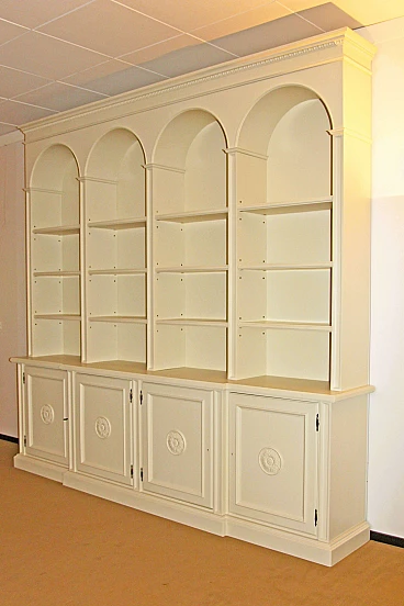 Splendid ivory-white lacquered wooden bookcase-case. Handcrafted in the 60s, Made in Italy (Brianza). Traditional construction with solid and hollow-core wood. The base consists of 4 wooden doors with central tableau and key lock; the two central doors are projecting; all doors are equipped with internal shelves. The open upper part is divided into four partitions, each with three adjustable shelves, and is completed by four arches with moulded top cornice. Classical-style fittings with burnished brass. Showpiece in excellent condition; only slight signs of time.
