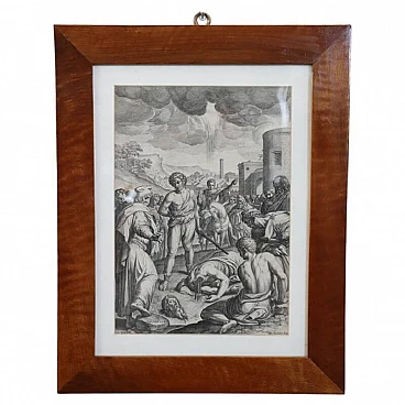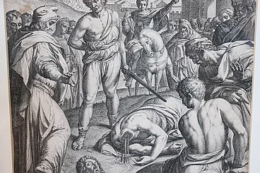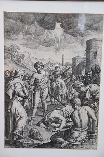 Beautiful 16th-century antique engraving with walnut frame depicting "The Beheading of Saint Paul" by Johann Sadeler I. Perfect condition. Size with frame: 40 x 31 cm. The Sadelers were a family of Flemish artists, mainly engravers of reproductions, active throughout Europe between the 16th and 17th centuries. The style of the family members is very similar and not always easily distinguishable; for three generations, moving from Holland to Italy, stopping in Germany and Prague, these engravers, publishers and print dealers played a central role in the dissemination of images. From 1572 Jan/Johan worked in Antwerp, then the world center of printing. With his younger brother Rafael the Elder he initially moved to Cologne, but unrest in the Dutch revolt forced the Antwerp artists to relocate, so the Sadelers came to Italy in 1593, to Venice, where they opened a print shop. Seller provides professional packing - insured shipping by courier - delivery by appointment - street level only, no porterage to floors.