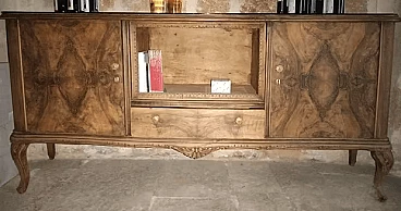 Briar-root veneered wood sideboard with black glass top