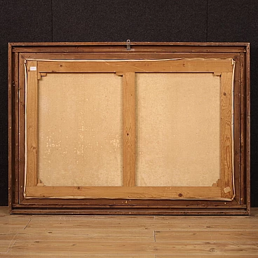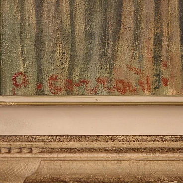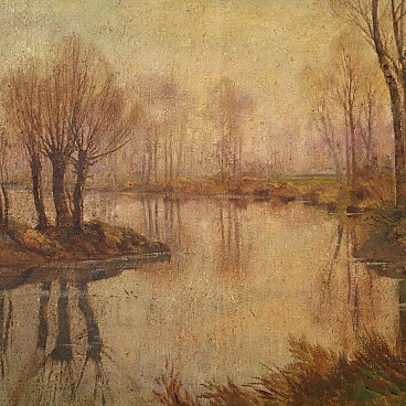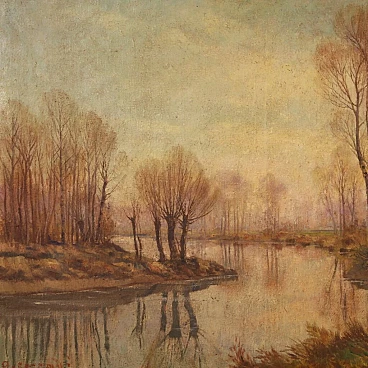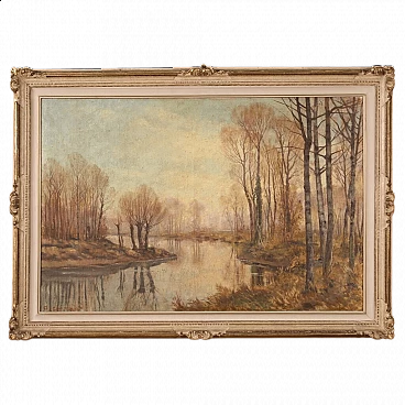 Oil painting on canvas ("in prima tela") from the mid-20th century depicting an autumnal river landscape. Adorned with beautifully decorated lacquered and gilded wooden frame (bronze tint), with some minor color lacks. Signed lower left "A. Corradi" (see photo), referable to painter Alfonso Corradi (1889-1972); lacking authentication. Painting of pleasing depth, ideal for inclusion in a salon or living room. Painter was good at creating the mirror on the river reflecting the sky and trees (see photo) and the many autumnal hues. Work in patina, in good condition with some signs of time. Size without frame: 78 x 118 cm.