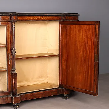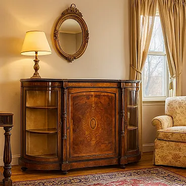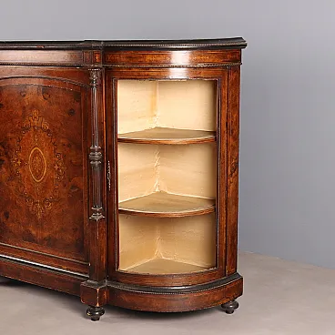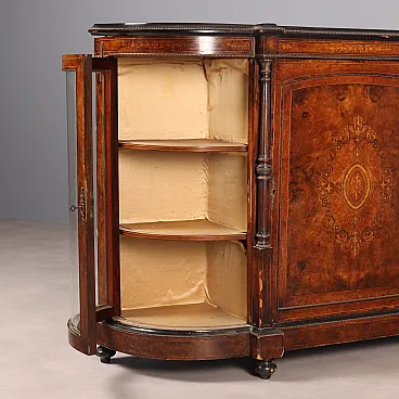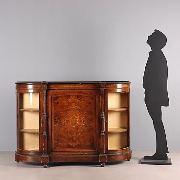 Cabinet with shaped and moulded top from which two projecting columns separate the central front door from the two side cabinets. The entire structure is veneered in walnut burl and decorated with ebonised wood, inlays of various woods and bronze frame. Late 19th century Italy.