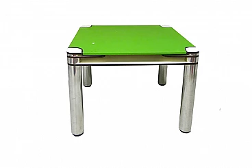"Poker" is the gaming table designed by Joe Colombo for Zanotta Italia in 1968. Its top is made of layered white plastic laminate and the structure is made of tubular stainless steel legs with black plastic levels. In addition the table has four swing-away ashtrays and green cloth on the top. The removable ashtrays can also become drink holders. Please note a recent small restoration to the green cloth.