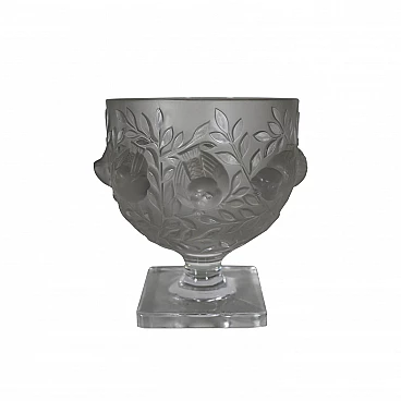 Cup in transparent crystal partially satin-finished moulded with decoration of sparrows and leaf shoots. Under the base is a scratch signature of the manufacture "Lalique-France". Object in good condition, has imperfection on the beak of a bird.