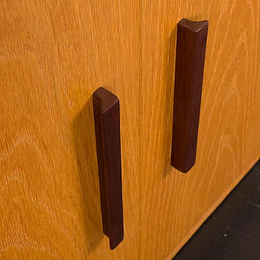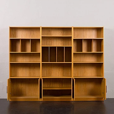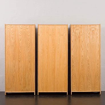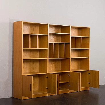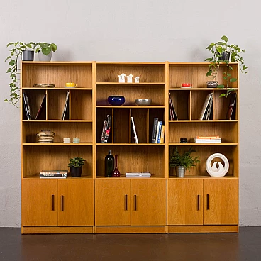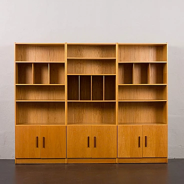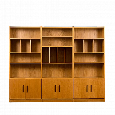 This set of three oak shelf modules was designed by Ib Kofod Larsen and produced by the Danish Faarup Mobelfabrikk in the 1980s. It can create an impressive bookcase together or divided if necessary. Manufacturer's labels are retained, confirming the designer and origin. It is made up of three independent modules, each with a cabinet and a functional arrangement of shelves and compartments, ideal for vinyl records or magazines. This vintage bookcase, oak veneer with a pleasant color and well-grained wood, will warm up any interior, while offering plenty of space for books, vinyl and decorations.