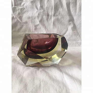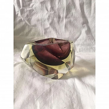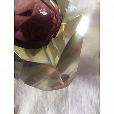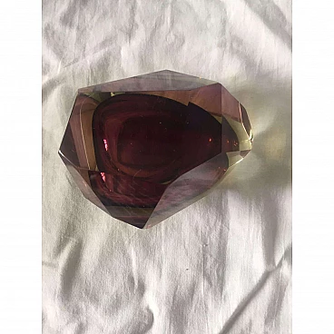 Seguso is a leading name in Murano glass, known for its exceptional craftsmanship and innovative design. The term 'Submerged' refers to a technique used in Murano glassmaking, in which several layers of coloured glass are fused together, creating a unique effect. In the case of your ashtray, the purple colour is probably enclosed within layers of clear glass, creating a distinctive appearance. The outer surface has multiple flat surfaces or cut-outs, providing additional texture and visual interest. This faceting technique is commonly used in modernist design to create geometric and angular shapes. Due to its size, the larger format of an ordinary ashtray makes it more functional and visually striking. In short, it is a Murano glass collector's piece that represents the artistic and design sensibility of the 1970s. This ashtray is the ideal object to create a perfect moment for your favourite space and home.
