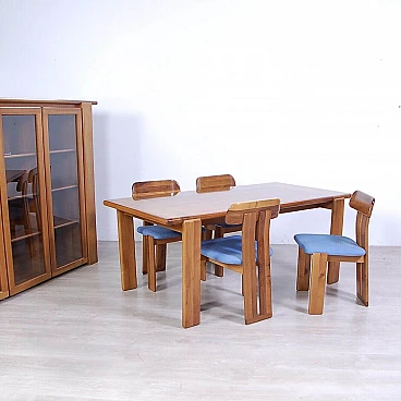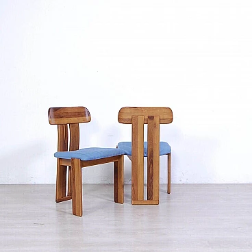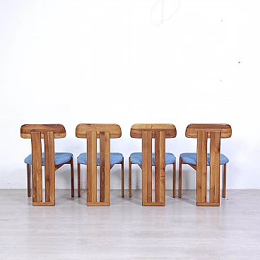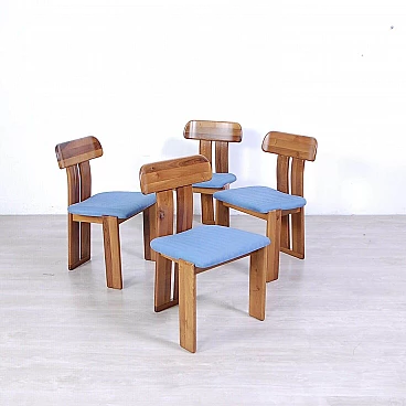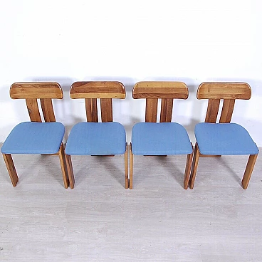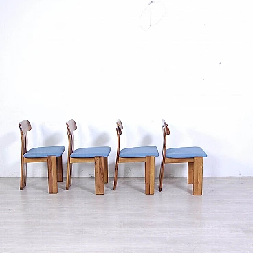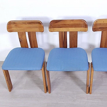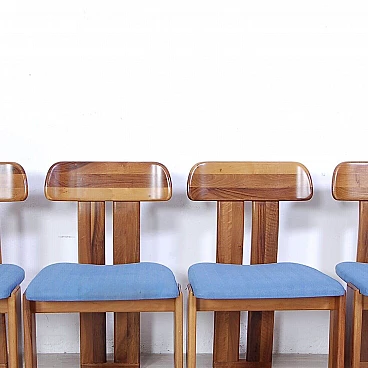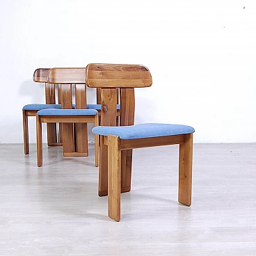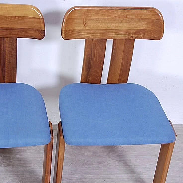 Set of four chairs from the Marengo series by Tarcisio Colzani for Mobilgirgi, 1970s. They are very well known and much appreciated (bibliography: Abitare, n. 213, 1983). Structure in solid walnut wood with walnut veneer; warm and bright color with shades that give flavor to the piece. The seat was redone over the years and now has a cerulean blue fabric covering; there are stains on the fabric (see photos). They are in good condition with light and normal signs of wear. Seat height: 47 cm. Also available, by Mobilgirgi too and in other adverts, are a display case, a table and a sideboard. Mobilgirgi was a famous Italian company specializing in the production of high quality designer furniture; founded in Cantù in 1968, it remained operational until the early years of the new millennium.