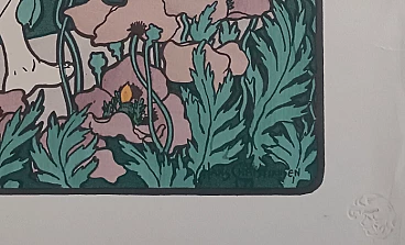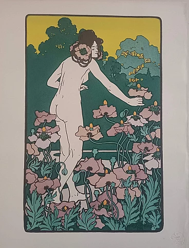 The lithograph represents a young naked woman from behind who proceeds picking pink poppy flowers. The background is occupied by two profiles of green trees and a lemon yellow sky. The lithography was made for L'Estampe moderne, a magazine published in Paris by l'Imprimerie Champenois in monthly issues, each containing four prints, between May 1897 and April 1899. In particular, this subject is for issue no. 11 of March 1898. It is accompanied by a tissue paper bearing the title, the artist's name and a poem "La lune est rouge (…) c'est la nui" by Paul Verlaine. The editorial initiative, the result of a collaboration between the young Italian publisher Henri Piazza and the art critic Charles Masson, aimed to offer a wide audience access to the engraving market and raise awareness of the works of the most famous French artists. The circulation of the magazine is 2000 copies. Signature engraved inside the subject at the bottom right. Vividly colored impression on thick white paper, sheet applied to vintage cardboard. Excellent state of conservation. Embossed stamp lower right in the white margin of the Estampe moderne magazine.
