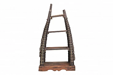 This is a rare etagere or bookshelf created with ancient fragments of colonial machinery for towing and working the land. The fragments are composed of 17th century elements and nails, while the union of the elements and the base are evident elements and nails of the nineteenth century. On the whole this piece is something atypical and brutalist, but certainly beautiful and in its kind unique and exclusive.