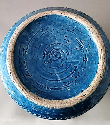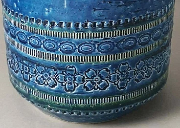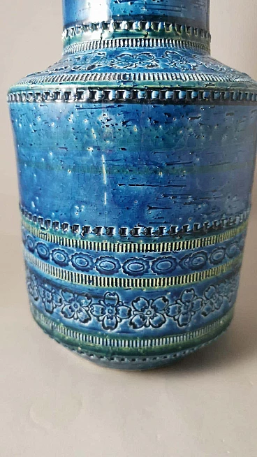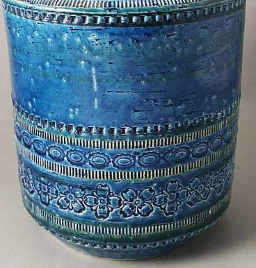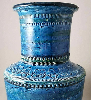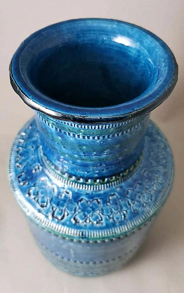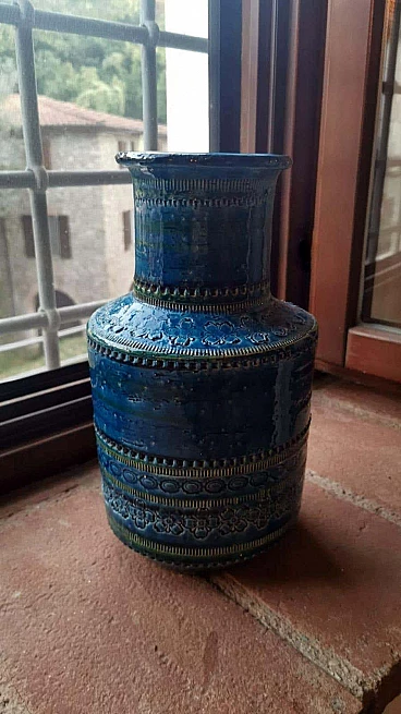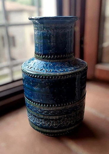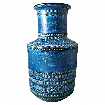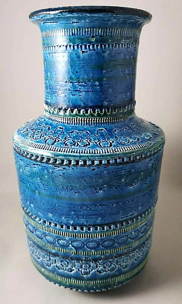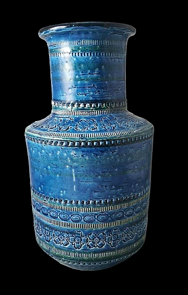Iconic glazed ceramic vase. The shape was made by pressing in white refractory earth, the stencil decoration with different motifs was executed. The object was first fired and then blue 'cristallina' was applied; at this point the vase was fired a second time to fix the cristallina. Crystals' are special glazes in which the vitreous part predominates over all the other components. crystals can be transparent or coloured, the coloured ones make the engraved surfaces and bas-reliefs stand out, the workings of our ashtray with the beautiful blue colour of the crystalline acquire body and visibility. The vase was designed by the ceramist Aldo Londi and produced between 1965 and 1968 by the Bitossi company of Montelupo Fiorentino (Tuscany). The Bitossi family has been present in Montelupo Fiorentino since 1536; the Bitossi family were versatile artists but more than anything else they devoted themselves to ceramics. In the early years of the 20th century they proposed an extraordinary stylistic and formal renewal with their production; but it was from the 1950s, under the direction of Aldo Londi, that the evolution in a modern direction became disruptive, an evolution that would continue over the years with the collaboration of important Italian and foreign designers, leading the Bitossi family to represent Italian excellence in the world. Aldo Londi (1911-2003), painter, sculptor and above all ceramist, who joined Bitossi in 1946, was a man with a strong creative spirit, attentive to the changing tastes of the markets, convinced of the uniqueness of Italian products; he was the undisputed protagonist of the style of Bitossi production for more than fifty years, putting his great artistic skills and his untiring desire to experiment at the service of the company. Width 17 cm diameter, height 31 cm. The vase is in excellent condition. For all our shipments we use special packaging materials (wooden crates, polystyrene, etc.) to ensure maximum protection and safety of the objects.