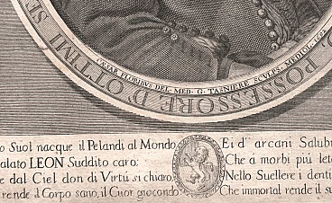 In this engraving, taken from a drawing by the Milanese painter, architect and engraver Cesare Fiori (ca. 1636-1702), the half-bust portrait of Giacomo Filippo Pelandi, an Italian doctor of the 17th century, is represented within an oval, born on 10 October 1633. The man of science, with a beard and long hair, is shown in a suit described in detail against a background of dense crossed lines. Below the image on the sides of a shield with a rampant lion, four lines on two columns in Italian describing the skills of the toothpick doctor. An example is preserved in the Davoli collection in Reggio Emilia (Davoli 23670). The extraordinary portrait was already cited by Bortolo Belotti in his Storia di Bergamo e dei Bergamaschi in 1959 and more recently by Francesco Baccanelli in the article "Antidoors, frontispieces, engraved portraits. Artists active in Bergamo between the sixteenth and eighteenth centuries at the service of the book".