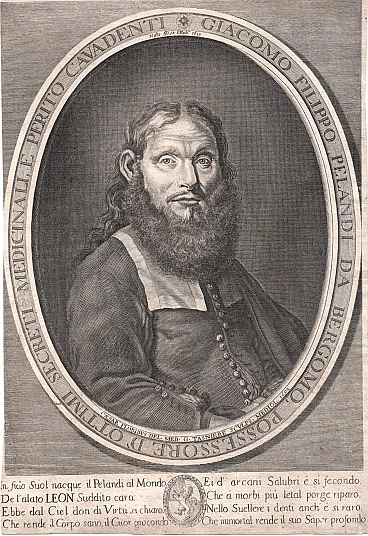 Burin engraving "Giacomo Filippo Pelandi da Bergomo, Possessor of Excellent Medicinal Secrets and Expert Tooth Extractor" made in 1692 by Georges Tasniere (Besancon 1632 – Turin 1704).