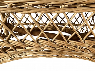 Beautiful mid-century rectangular bamboo and rattan coffee table for living room or dining room with glass top. Produced in the 1970s in Italy. The table frame consists of four curved bamboo legs reinforced by a natural cane overhang. The top structure is adorned with beautiful criss-crossed reeds and protected by a perfectly fitting glass top. The whole is solidly held together by handcrafted wicker. This exquisite object will be perfect for a Mediterranean-style living room or any boho-chic corner of the house, even a beautiful outdoor terrace.