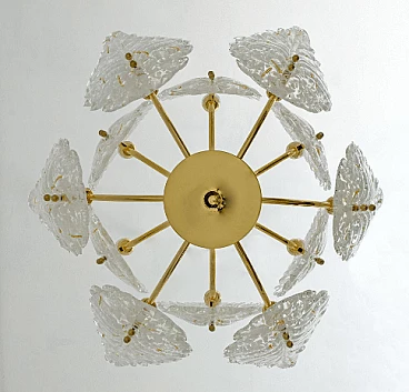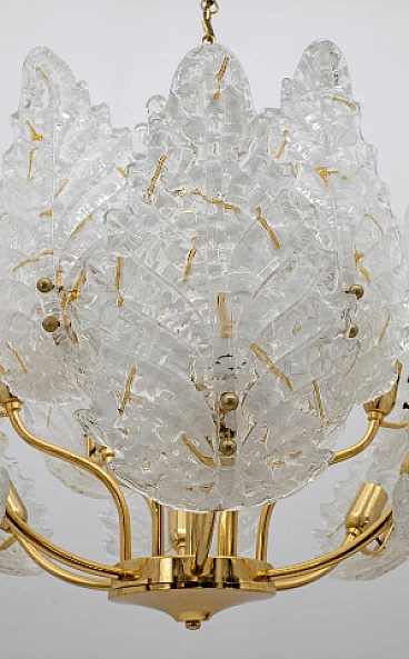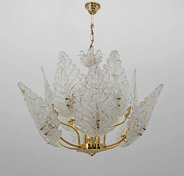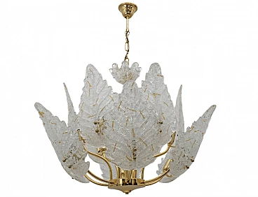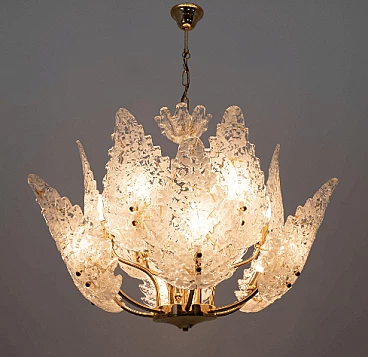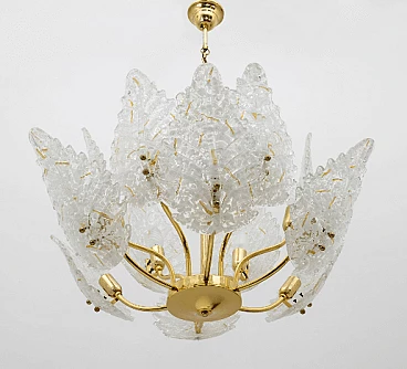Twelve-light brass chandelier with Murano glass leaves, 1970s