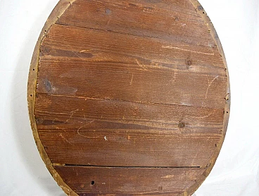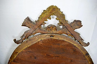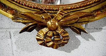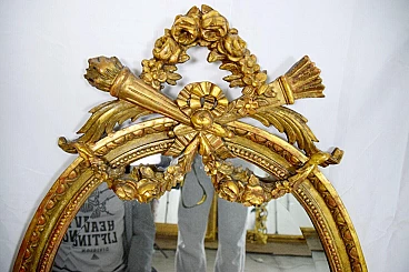 Louis XVI style oval carved and gilded wood mirror made in France in the 19th century during the Belle Époque period. Original beveled glass and finely carved cartouche depicting the royal symbols of Louis XVI. The arrows of justice crossed by a flaming torch of truth are joined by a floral crown and a tied bow. The flaming torch is an ancient symbol of life, truth and the regenerative power of fire, while the quiver of arrows indicates the ability to use force in the pursuit of justice. On either side of the torch and quiver is a garland of roses and other flowers and foliage. At the base of the frame there is another scroll. The oval frame surrounds the original beveled mirror glass which retains the familiar blemishes and flecks of truly antique glass. The inner edge features "les perles" (beads that resemble a string of pearls) alongside antique mirror glass. The color of the frame is original and is a combination of gold leaf gilding and gold paint gilding. Different types of gilding were used to achieve different shades of gold and therefore more definition.