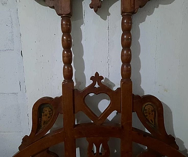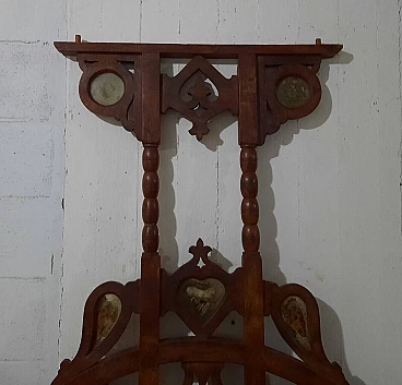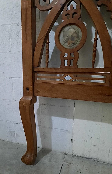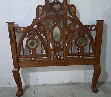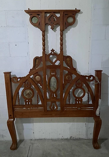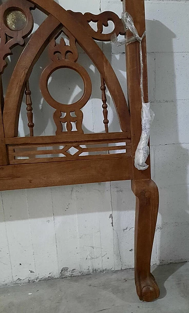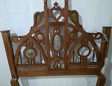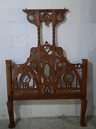 Letto in noce in stile gotico italiano. XIX secolo. Inserti in marmo/pietra, di cui uno mancante, la testata/pediera ad arco entrambe con archetti interni e cuori traforati centrali, in alto si trovano ulteriori aperture traforate rialzate su supporti a bobina, entrambe sono su gambe quadrate cabriolè, due sponde laterali e giroletto a doghe. Negli anni recenti, per rinforzare la struttura, sono stati inseriti bulloni fra le testate e le sponde, non avendolo mai montato non si dà per certo che siano presenti tutti i bulloni. Da restaurare. Dimensioni: H 200 – L 135 – P 205.