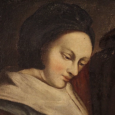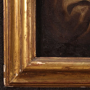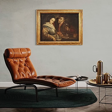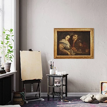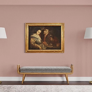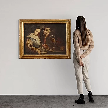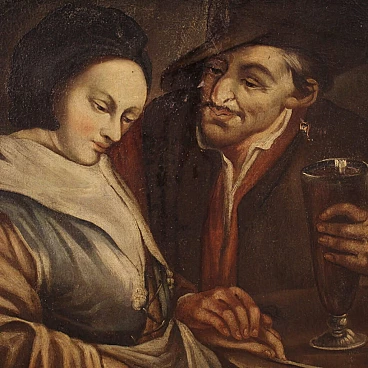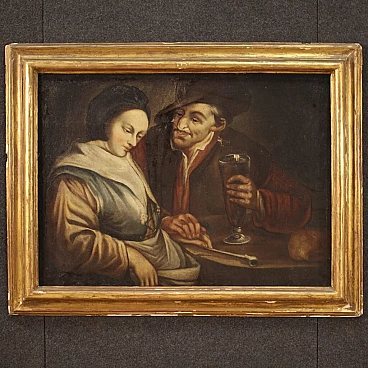 Flemish oil painting on canvas from the 18th century depicting a tavern interior scene with characters; good pictorial quality. Painting of nice size and pleasant impact. 20th century carved and gilded wooden frame with several signs of time and color lacks; in need of restoration. Painting that has undergone conservation restoration, color recovery in several places with patches added in the back (see photos). It has several signs of time and color lacks (see photos); in need to be restored. Size without frame: 70 x 95 cm.