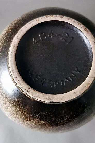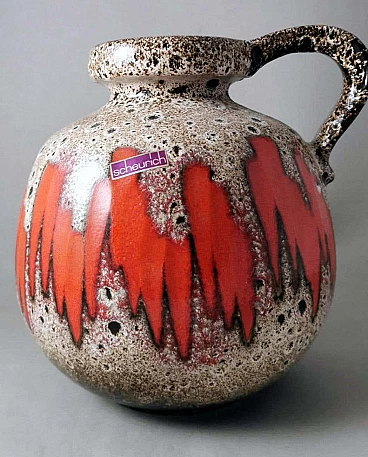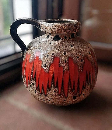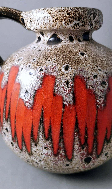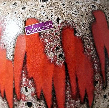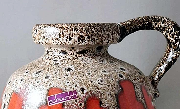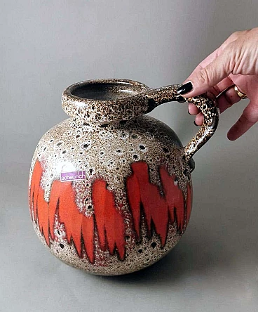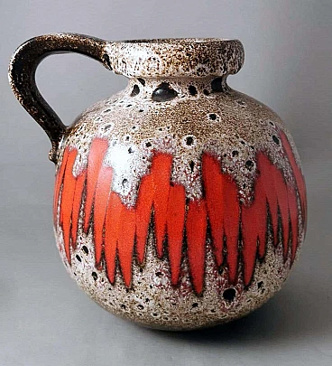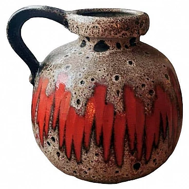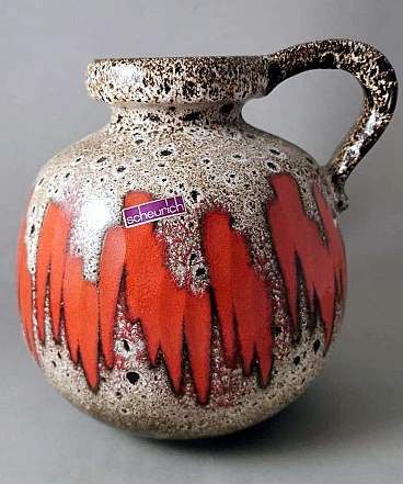 A distinctive and original coloured German ceramic jug. It has an innovative, modernist shape; the beautiful, vibrant colours are balanced and proportioned in keeping with a minimalist design. The glazing of the jug was achieved by first laying down one colour and firing it in the kiln, then the same process was carried out for the other colours. Very difficult to achieve is the speckled colouring, beautiful is the dripping effect of the vibrant red shade. The mark on the bottom tells us that the object was created in a limited series, the jug is number 484 and 21 is the model number; it was produced in Germany between 1968 and 1971 by the Scheurich Company (see sticker). Founded in 1928 by the visionary Alois Scheurich, this German company conquered the art world. Specialising in decorative and functional ceramic vases and jugs, it has gained a cult following among collectors and enthusiasts. Their objects are true masterpieces, displaying impeccable craftsmanship, unique designs and revolutionary glazing techniques. Each model they create tells its own captivating story, with distinctive features and fascinating motifs. Fat Lava' is the name given to a certain style of West German art pottery popular in the post-war period and characterised by an extravagant amount of typical shapes, glazes, textures and colours ranging from dark brown to orange, forest green to cobalt blue, ruby red to canary yellow; the production strategy of the craftsmen of this style involved rather simple and strict shapes which, in combination with all the different decorations and coloured glazes, resulted in a very wide range of pieces. Our jug has beautiful and harmonious proportions and, thanks to this strong personality, can be incorporated into any style of décor. The jug is in excellent condition. It measures 22 cm in diameter, 24 cm in height. For all our shipments we use special packaging materials (wooden crates, polystyrene, etc.) to ensure maximum protection and safety of the items.