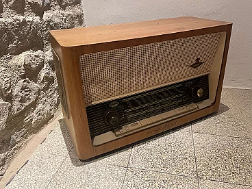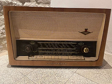 This model is not just any Nordmende Carmen, but a Nordmende Carmen HI-FI. The acronym HI-FI, far from having any pretensions to true high fidelity, identifies a model that is very different from its predecessors, with its own keyboard, filters, output stage etc., which we only find in the few higher models. It is a rather important device, with a classic line and characterised by a good level of performance. A nice woofer with a large Alnico magnet and two side cone tweeters. The cabinet is very nice and highly polished. Nordmende's care and precision in its production is well known. The quality of the components is known especially to German collectors. Suffice it to say that the valves, for those who know what they mean, are all Telefunken and in the models with a counterphase output stage they are even numbered. This unit represents the maximum evolution of the Carmen before the radical and questionable line change of the later models. The sound doesn't quite match that of the Tannhauser, the bass isn't as deep and the treble isn't as crystal clear up front, but the size makes it easier to place in the room. Nordmende Carmen Vintage Radio: a timeless classic in sound and design. A true masterpiece that embodies the elegance of a bygone era and offers a sound experience like no other. Immerse yourself in the world of mid-century design and audio excellence with this exceptional piece of history. Iconic mid-century design: Nordmende Carmen is a triumph of mid-century design, boasting beautiful wood cabinetry, carefully crafted details and a timeless aesthetic that captures the sophistication and charm of its era. Exceptional sound: enjoy the rich, warm sound of this vintage radio. Its premium speaker and finely tuned components ensure exceptional sound quality that resonates with nostalgia and clarity. Quality craftsmanship: meticulously built to last, the Carmen has stood the test of time. Its enduring build quality ensures that it will remain a functional and valued piece for generations to come. AM/FM radio: experience the pleasure of easily tuning in to AM and FM radio stations, exploring a wide range of music and broadcasts. Vintage condition: restored to its original splendour, the Nordmende Carmen retains its vintage charm while functioning perfectly. It is ready to become an elegant and functional addition to your living space. Collector's delight: the Nordmende Carmen is a sought-after collector's item, appreciated by vintage radio enthusiasts, mid-century design aficionados and audiophiles alike. Its historical significance and enduring appeal make it a prized possession.