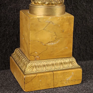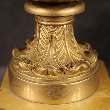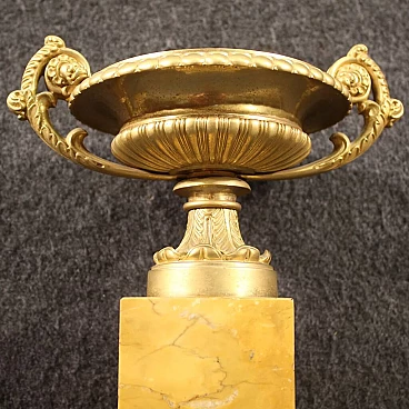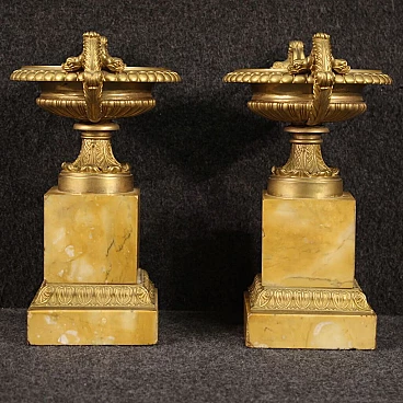 Pair of Italian risers from the first half of the 20th century. Gilded and chiselled bronze items with a square plinth base paved in marble. Fabulously decorative risers, ideal for display above a fireplace or desk, for antique dealers and interior decorators. Bowls with side sockets adorned with zoomorphic elements, in classical style, of excellent quality. Objects of beautiful size and proportion that show small signs of time, marble with minor chipping and signs of conservative restoration (see photo). In beautiful patina, overall in good state of preservation.