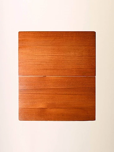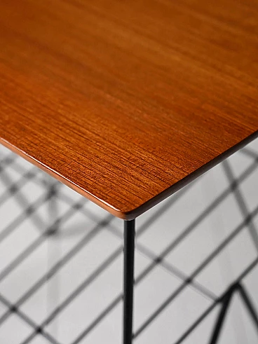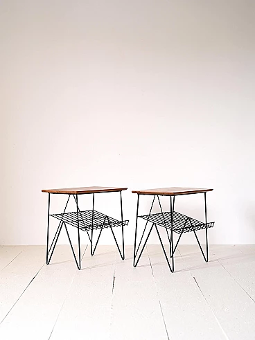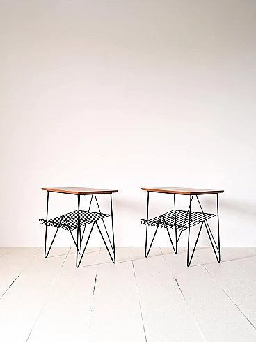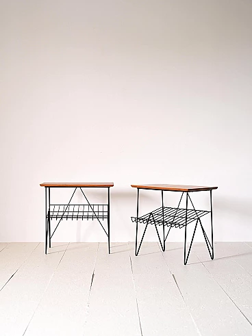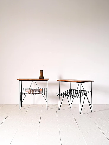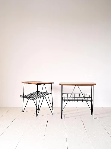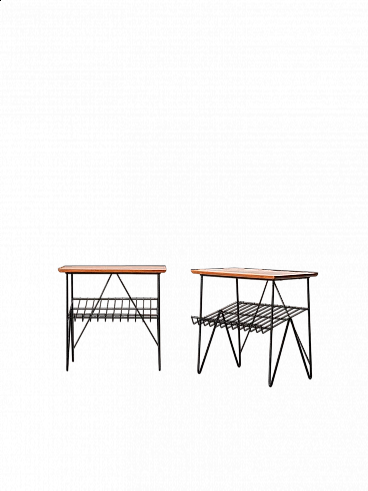 Pair of Swedish coffee tables, 1960s. They are distinguished by simple shapes and the use of metal juxtaposed with wood, a typical feature of mid-century design. They feature a teak top and a black metal magazine rack shelf. They can also be used as bedside tables. A conservative restoration has been carried out. They may show signs of time.