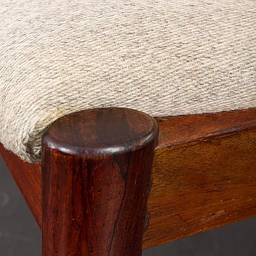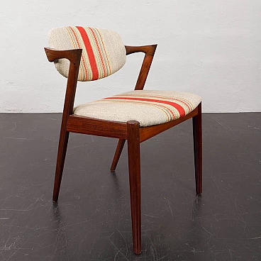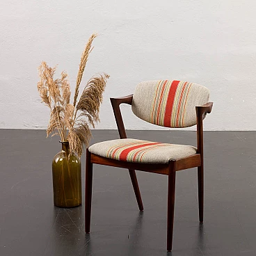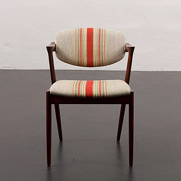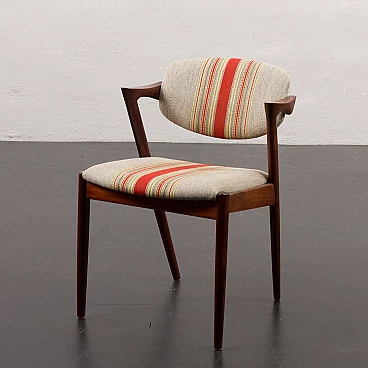 Chair mod. 42 by Kai Kristiansen for Schou Andersen made in Denmark in the 1960s. Solid rosewood structure and original natural wool upholstery with intriguing colored striped pattern. This model has a comfortable backrest and a stable solid wood structure. The chair mod. 42 perfectly exemplifies the fusion of form, space and functionality of Danish modern design. It was possible to preserve the original fabric which is almost intact. However the seat foams had to be replaced, which added a lot of comfort. The chair is solid and sturdy. The wood has been cleaned and preserved with professional products; usually small signs of use are left which do not ruin the aesthetics of the furniture and only confirm its originality.