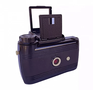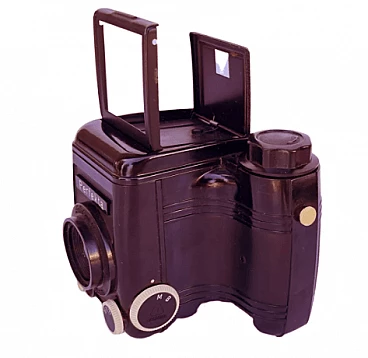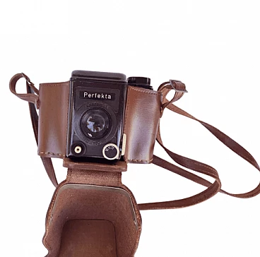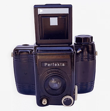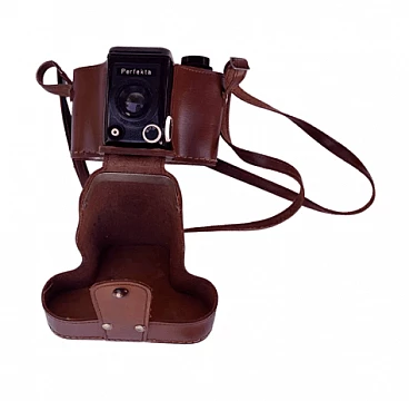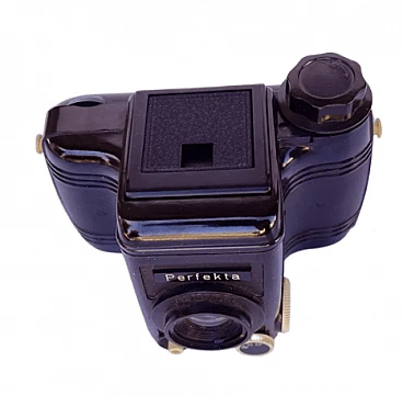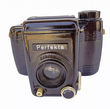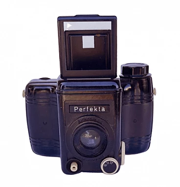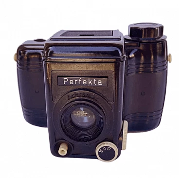 Perfekta Aeromat camera produced around 1954 at the VEB Rheinmetall factory in Sömmerda/Thuringia. It is made entirely of Bakelite and has a large viewfinder with a folding frame. The objective is 80mm achromatic (kb equivalent: 41.025mm). The shutter speed is set to 1/25 s. There's a dial under the lens that lets you select three aperture sizes. The release button is located next to it. One roll of film is sufficient for 12 exposures in the 6 x 6 cm format. The manufacturer's name is imprinted on the back. The item is in excellent condition, technically functional, not checked with film. The camera is sold with a leather case. Manufacturer: VEB Mechanik Büromaschinenwerk Rheinmetall. Production: 1954. Classification: medium format. Body Type: Solid Body. Film type: 120. Film width: 62 mm. Image size: 6 x 6 cm. Number of images: 12. Lens type: achromatic. Focal length: 80mm. Focus Type: Fixed. Focal length range: 8 feet – lower. Opening type: variable stops. Apertures: f/7.7, f/11, f/16. Shutter type: swing. Shutter speeds: b, I (1/50 s). Open dimensions: 13.5 x 13.5 x 9.5 cm. Closed dimensions: 8.6 x 13.5 x 9.5 cm. Weight: 354 g.