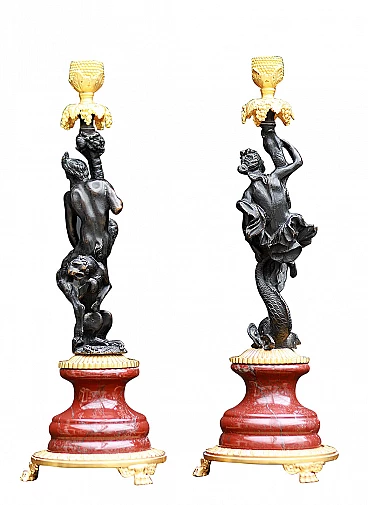 Pair of Neo Baroque candlesticks in bronze and gilded bronze, 80s
