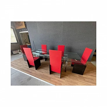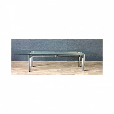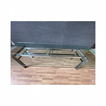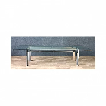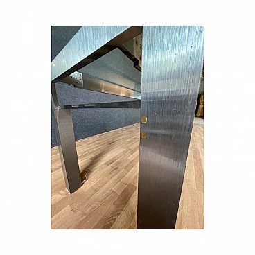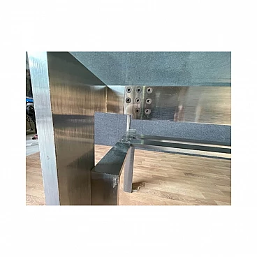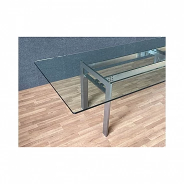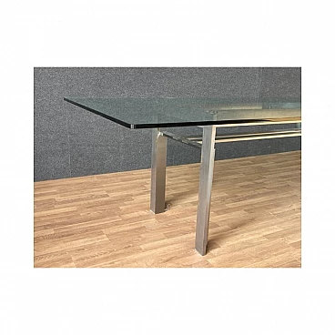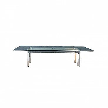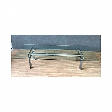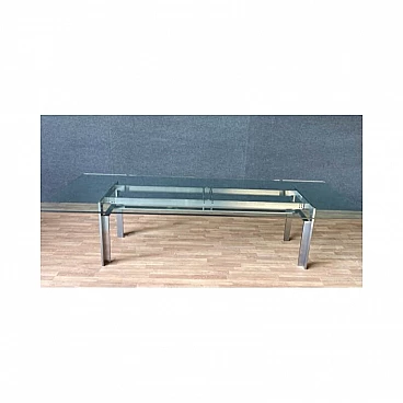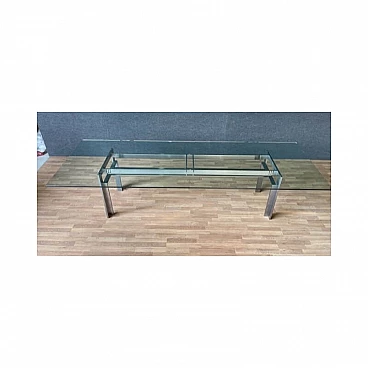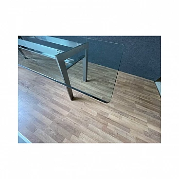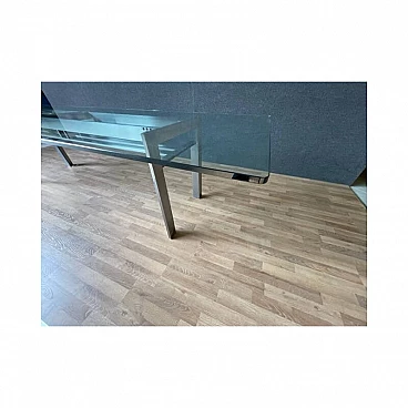 Steel and crystal Doge table designed by Carlo Scarpa for Simon in 1968. With the Doge table Scarpa began production for Simon, starting a series of projects called Ultrarazionale; Scarpa tried to invent a production that goes beyond rationalism by proposing a new essential linearity. With the Doge table, production began for Simon, founded by Dino Gavina after having sold the company to Knoll in 1967. The Doge table was born as a variant of a table that Scarpa had designed for the Zentner house in Zurich in which the ebony top it is replaced by a thick glass top. This replacement allows the entire structure of the table, the assembly and the screws to be clearly visible, thus creating a strong architectural impact and a sort of beauty in the final expression.