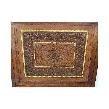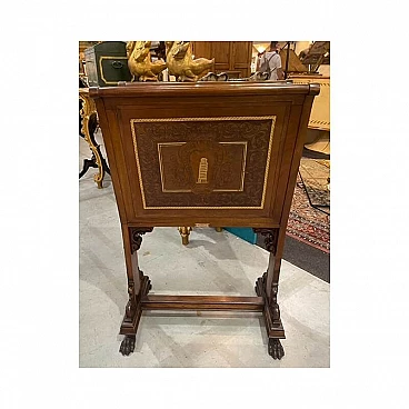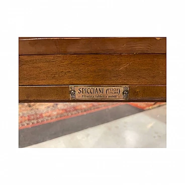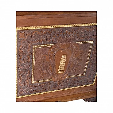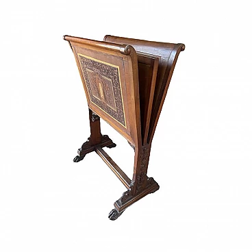 Walnut magazine rack made by the Premiata fabbrica di mobili Spicciani in Pescia (Tuscany), late 19th century. Characterized by decorative elements carved into the wood and feral feet at the base, the upper part opens like a fan creating two spaces for storing documents. The two facades are embellished with large engraved leather shapes with gold finishes, one of which depicts the Tower of Pisa. It bears the original brass plate engraved with the words "Spicciani Pescia-Toscana Premiata fabbrica di mobili". Base depth: 46 cm. Upper part depth: 35 cm.