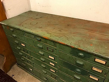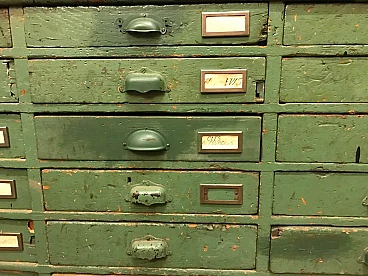 Mobile da negozio in legno di pino verniciato verde, con numerosi cassetti rettangolari di diverse dimensioni, tutti completi di porta targa in metallo. Lavorato anche sul retro. Fine ‘800, difetti.